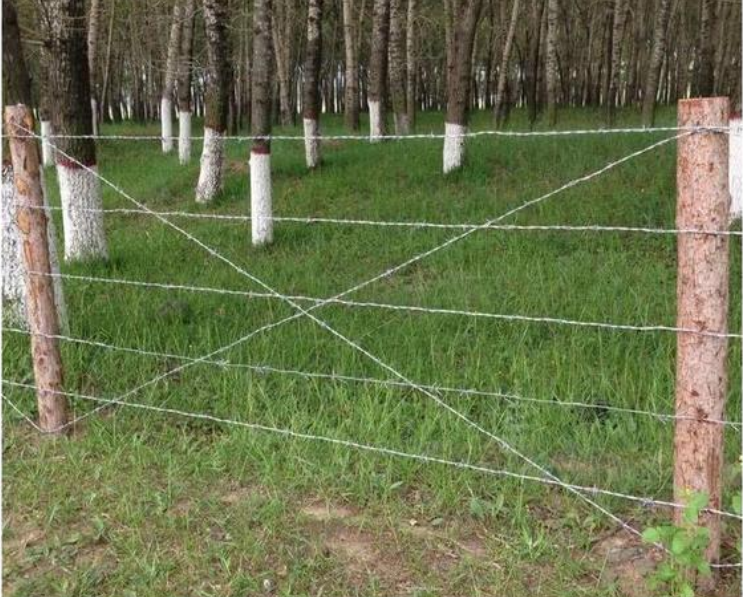 防爬刺絲剌網和立柱搭配使用效果好,每道刺絲刺網之間的間距一般為15- 25公分,高度1.8米,需要9道。農場畜牧業常用的是這種,中間的立柱我們采用方鋼或者是圓鋼使用。支撐立柱焊接固定鉤子,把防扒刺絲剌網固定上面,把勾子拍下去即可。這是常用做法。