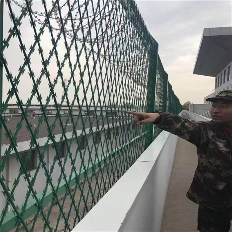監(jiān)獄安全網(wǎng)圍欄頂部按照要求安裝蛇腹形刀刺網(wǎng),立柱頂部的V型直接兩個側(cè)臂焊接有專用的刺網(wǎng)勾,是每個側(cè)架設三道熱鍍鋅鋼絲,形成一個V型槽,然后把刀刺網(wǎng)放到上面,再用配套卡扣把鋼絲和刀刺網(wǎng)連接到一起,如果V型架內(nèi)安裝V型網(wǎng)架,安裝就更簡單了, 直接把刀刺網(wǎng)連接到V型網(wǎng)上面就可以了。