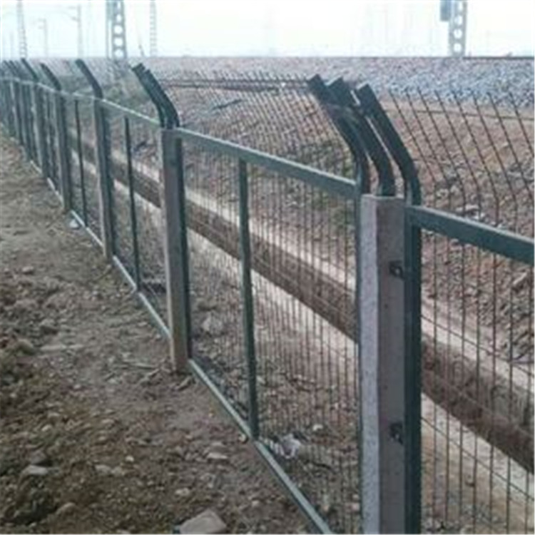 4、在高壓輸電線穿過安裝鐵路圍網(wǎng)的地方,護欄網(wǎng)應按電力部門的規(guī)定接上地線。立柱的埋設應分段進行,先埋兩端的立柱,然后拉線埋設中間立柱。從縱向看,立柱的軸線應在一條直線上,不得出現(xiàn)參差不齊的現(xiàn)象;從高度看,柱頂應平順,不得出現(xiàn)高低不平的情況。尺寸和型號符合要求的鐵路護欄網(wǎng)網(wǎng)片,應按圖紙規(guī)定的方式從立柱端部開始牢固安裝到立柱的掛鉤上;或?qū)⒕W(wǎng)片安裝在鐵路內(nèi),鐵路與立柱連接應牢固。所有的網(wǎng)片及鐵絲均應繃緊而不變形,其安裝高度應符合圖紙規(guī)定。護欄網(wǎng)安裝完畢,立柱基礎均需進行最后壓實處理。